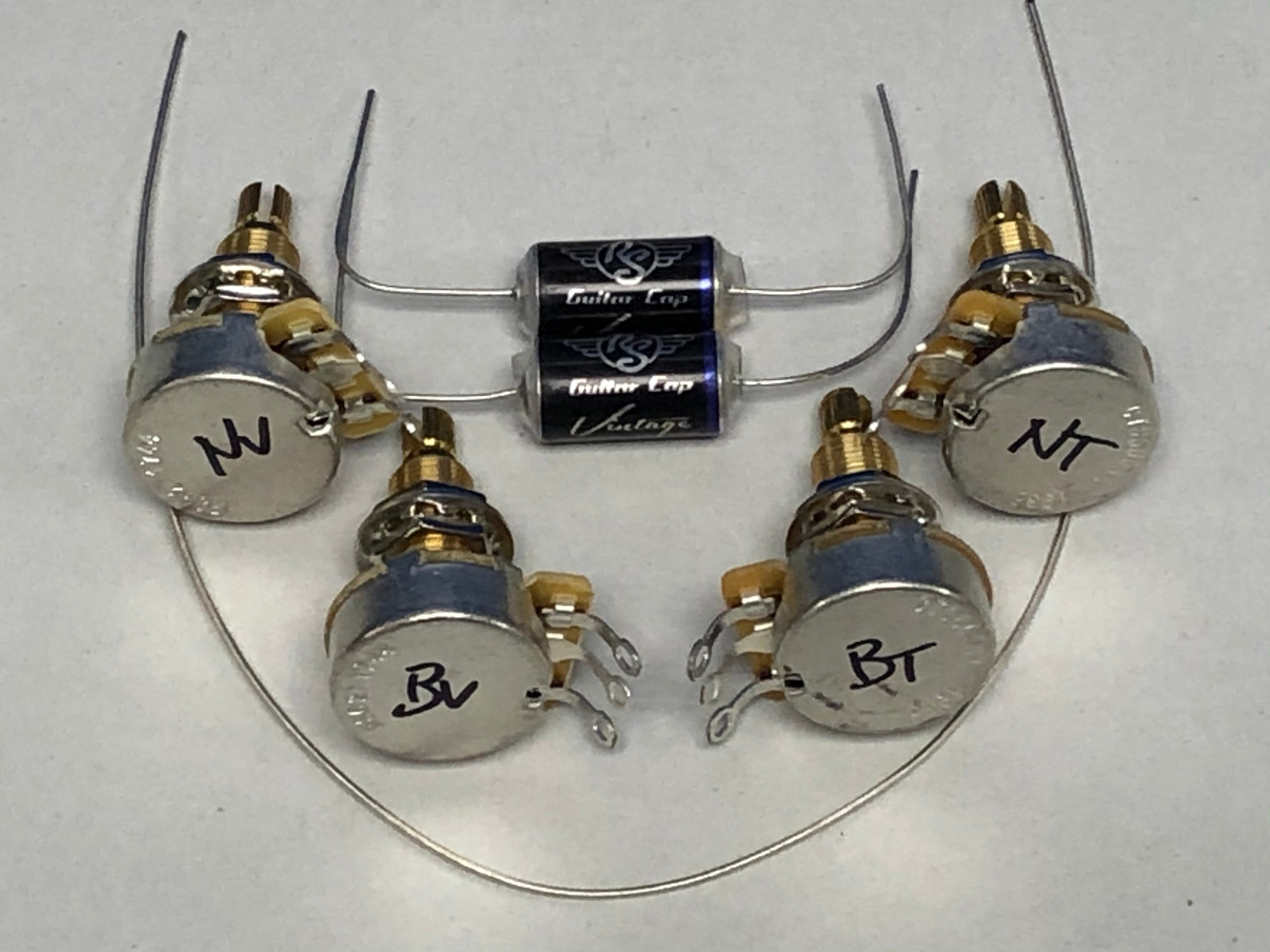 (1) 250K CTS Solid Shaft Audio taper pots- Audio taper pots work great for tone controls. With that in mind, we had CTS improve their stock audio taper pot by using brass shaft construction (brass is much more resilient than the typical aluminum,) and much tighter tolerances.